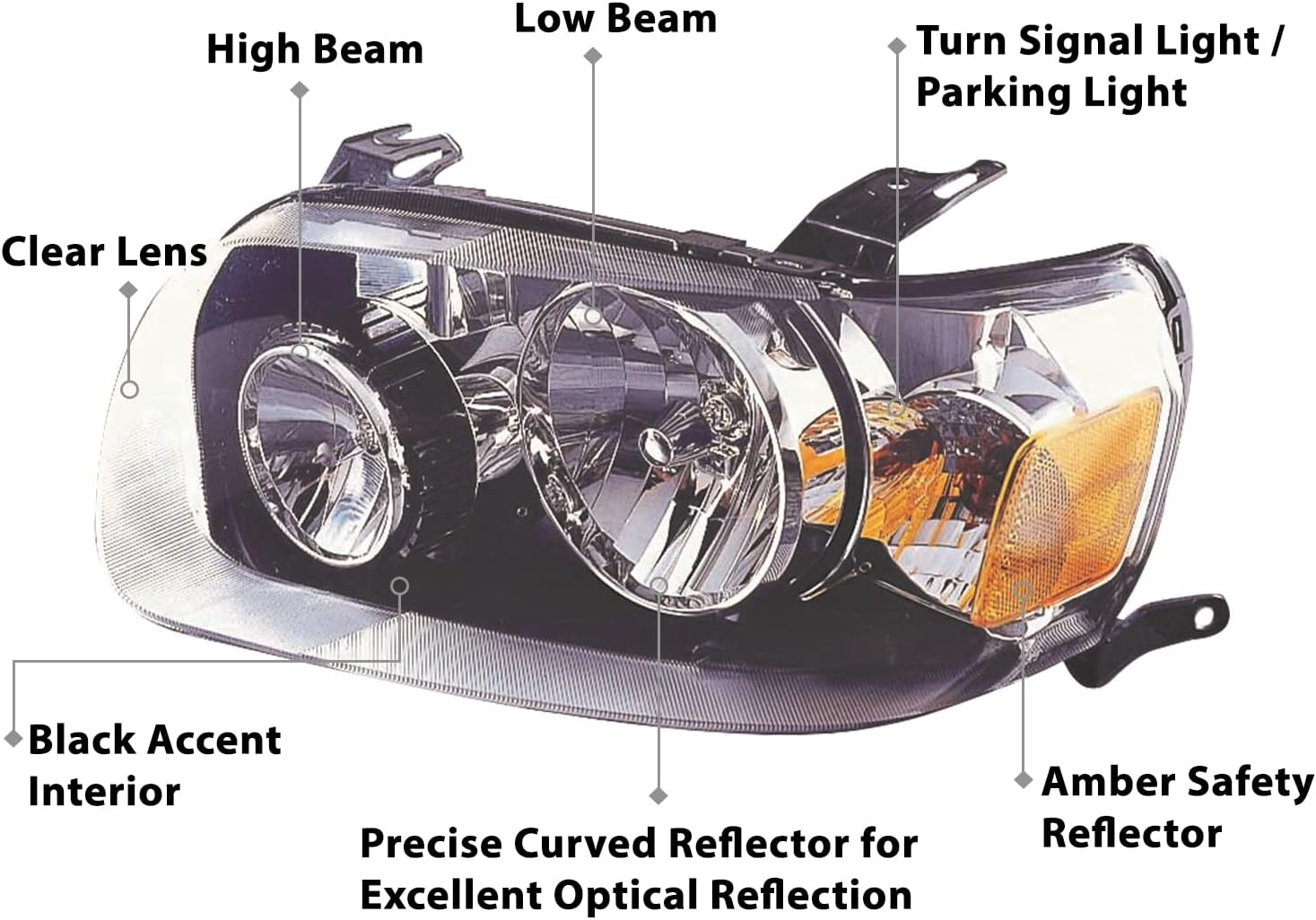 Item Description : Aftermarket OEM Replacement for Ford Escape / Escape HEV Headlight Assembly Driver Left LH Side Light Bulb Included. Bulb Type is the same as OEM Spec. Lens Coating 5-Year Warranty Features : Chrome Housing with Crystal Clear Lens , High Beam , Low Beam , Turn Signal Light , Amber Safety Reflector ; All Bulbs are Included Made in Taiwan (DOT) Department of Transportation and (SAE) Society of Automobile Engineers Approval Direct Replacement. Built to strict quality control standards. We recommend that installation be done by professionals, as item will not come with installation instructions and we do not provide any installation/troubleshooting assistance. Fits OEM Part Number : 7L8Z 13008 D , 7L8Z13008D Fits Partslink number : FO2518102 Fits Model and Year : 2007 2006 2005 07 06 05 Ford Escape / Escape HEV