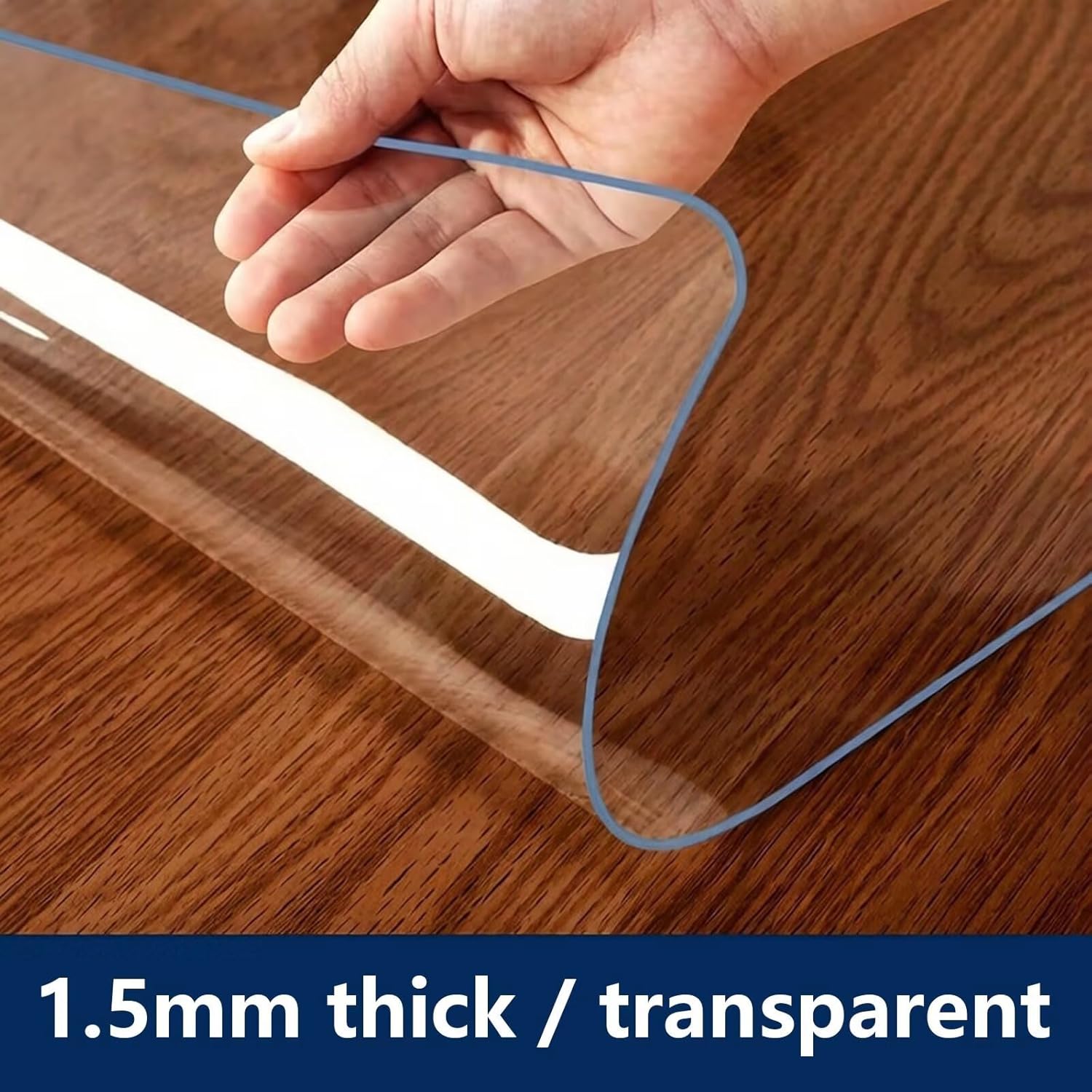 Clear PVC Table Protector – SOFT, DURABLE & MULTI‑USEKeep your furniture looking pristine while showing off its natural beauty with our heavy‑duty clear vinyl table protector. Made from PVC material, this soft yet tough cover shields all surfaces from scratches, scuffs and daily wear. You could put your pictures or photoes under the clear table protector!It’s ideal for daily meals, picnics, holiday spreads, family use and commercial spaces alike.1.5mm: Heavy enough to stay firmly in place, perfect for everyday home use.NOTE: When you get this item, you can take a plate of warm water, soak the table protector for 5 minutes, then wash it and let it dry outdoors for a day or two. After that the smell will basically disappear and use it.HOW TO CHOOSE THE RIGHT SIZE MODEL?Use a Measuring Tape to accurately measure the width and length of your tabletop, then find the corresponding size model from our Listings. (“Width X Length” Inches)Cut to FitIf we do not have the right size or are just out of stock, you can also choose a larger size to DIY. It’s easy to cut, you can mark the exact measurement with a pencil and use a sharp scissors or knife to cut.Clear Table ProtectorCompletely see through, showing theoriginal nature of the desktop.But there will be bubbles orwatermarks in contact with asmooth desktop, which is moresuitable for a textured desktop ordirectly on the tablecloth.SpecificationsShape: Rectangle, SquareThickness: 1.5mmMaterial: PVCColor: Clear.Package Content1 x Clear Desk Cover ProtectorVersatile Applications: perfect for wooden/marble/glass tables, dining tables, office desks, computer desks, TV stands, kitchen countertops, bedside tables, chair mats, and hard floors.