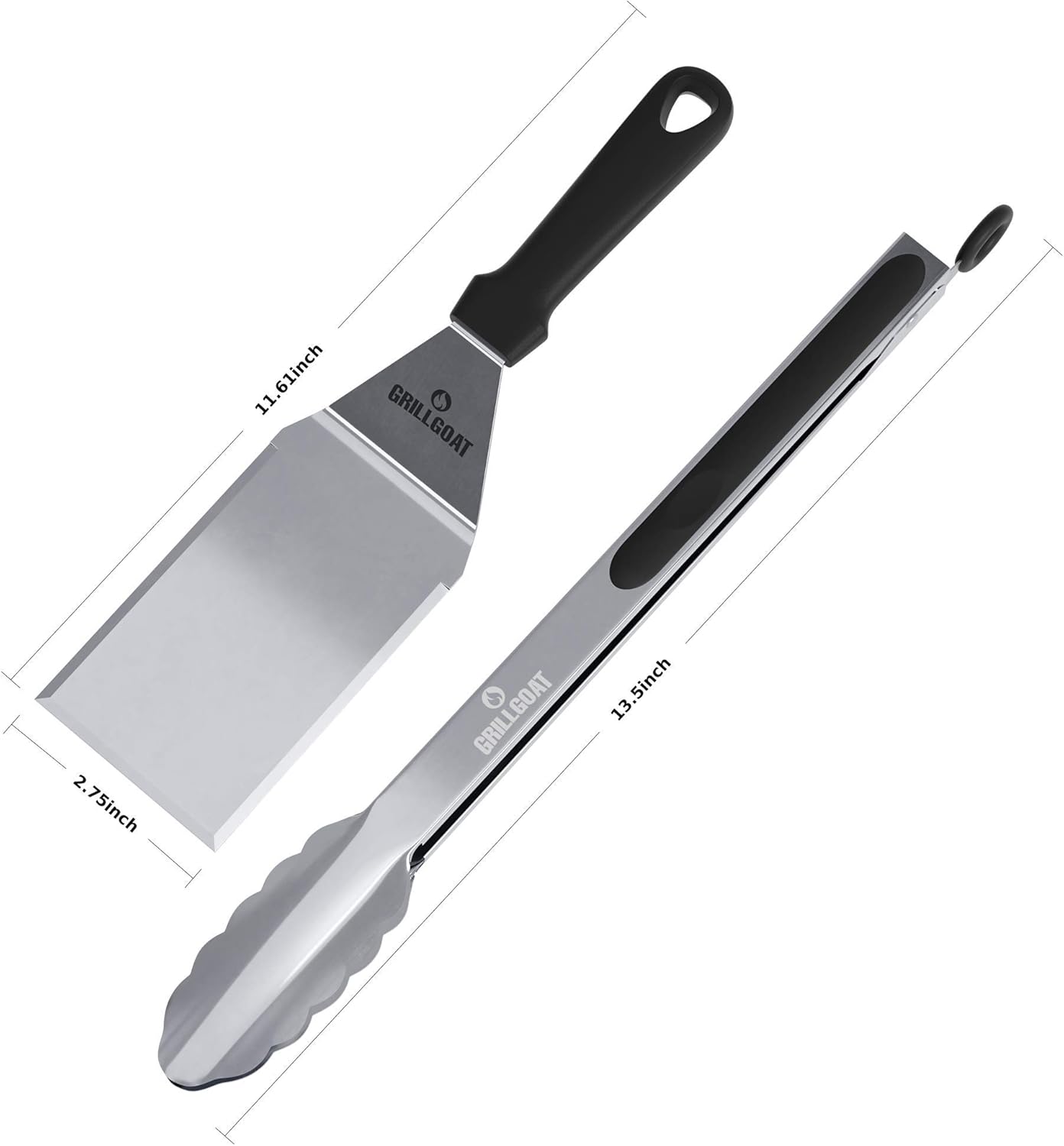 Versatile Set: This 11 piece flattop set has all the tools necessary to become the GOAT of the griddle game. Each tool is designed to feel like a natural extension of your hands allowing you to master the various heat zones with confidence. The set will take you from pancake flipper at breakfast all the way to channeling your inner hibachi chef with onion volcanoes in your home or outdoor kitchen.Everything You Need In One Griddle Accessories Set2 Oversized griddle Spatulas, nimble offset handles with rounded plastic grips1 Regular size metal spatula with beveled edges - go-to turner when the griddle is packed1 Extra Wide Burger Spatula - perfect for flipping burgers and grilled cheese sandwiches1 Chopper/Scraper with sharp edge, easy to dice food and scrape griddles clean.2 Silicone Egg Rings - Make professional looking eggs for breakfast sandwiches every time.2 Squirt bottles (400mL)1 Long Grill Tongs - 12in1 Premium Storage Bag - Keep everything organized and ready to goHigh-Quality Stainless Steel Construction Made from thick stainless steel, the tools are corrosion resistant, dishwasher safeThe oversized hanging holes are designed to slip on and off hooks with ease. When the heat is on, you don’t want to waste time struggling to get the spatula on or off a hook.Our products are tested extensively on our griddles and grills in Wisconsin. After countless attempts to get the perfect caramelized crust on our smash burgers, two things became clear. Our spatulas are built to last and smash burgers are a great way to make friends.Great Gift Idea - This premium quality gift box set makes a great present for the Grill Goat in your life. Click the add to cart button and unlock the potential of your griddle game.