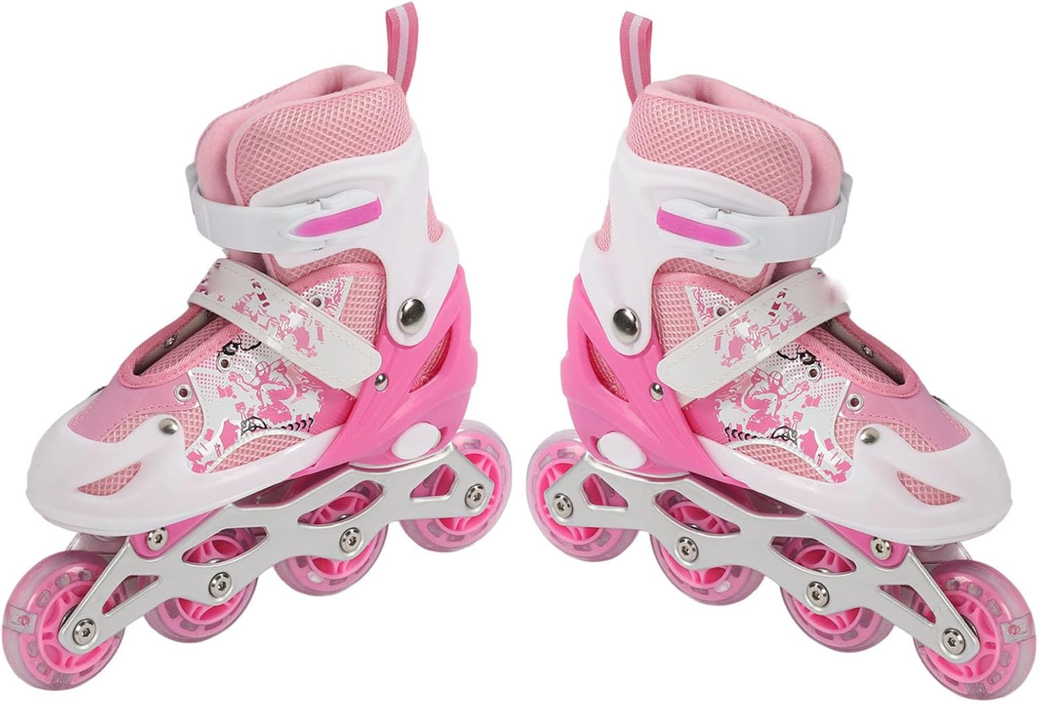[EXCITING FUN]: Experience the thrill of gliding with light up wheels, providing a joyous and exciting skating experience.[ EXERCISE]: Engage in full body aerobic activity, strengthening leg muscles, improving balance, and enhancing cardiovascular fitness.[ADJUSTABLE FIT]: Easily adjust for your child's growing needs, eliminating the need for frequent replacement.[BOOST CONFIDENCE]: Master skating skills and build confidence, courage, and overcome fears on the ice.[SOCIAL INTERACTION]: Join the skating community, make friends, and enhance social skills through communication and interaction.Spec:Item Type: Kids Inline SkatesMaterial: PVC, rubberWeight: Approx. 1982g/69.9ozPackage List:1 Pair x Kids Inline Skates2 x Knee Pads2 x Arm Protector2 x Elbow Pads3 x Training Bucket2 x Helmet1 Pack x AccessoryNote: