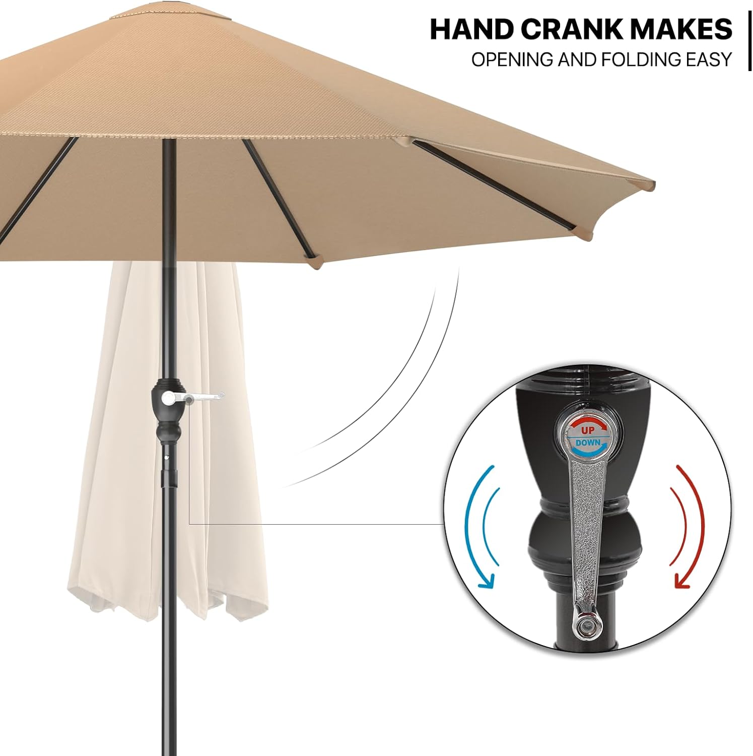 Experience the perfect blend of functionality and style with our 9ft. patio umbrella. Crafted for durability, it features a robust framework that stands firm against various weather conditions. The generous 9ft. diameter provides ample shade coverage, making it an ideal addition to any outdoor seating area, poolside, or large outdoor dining set. Despite its substantial size, our umbrella is remarkably user-friendly, allowing for effortless setup and take-down. Plus, its broad base compatibility means you have flexibility in choosing your support type. This patio umbrella is a top-notch choice for enhancing your outdoor space.Item Specification:Brand: MoNiBloomDimensions: 106"(D)106"(W)92.5"(H)Overall Product Weight (lb): 11.24Umbrella Type: Umbrella with CrankCanopy Material: 160g PolyesterFrame Material: 8 Steel RibsPole Material: SteelUV Protection: NoVents: IncludedOpening Mechanism: Crank LiftTilt Method: FixedAdjustable Height: FixedStand Included: Not Included