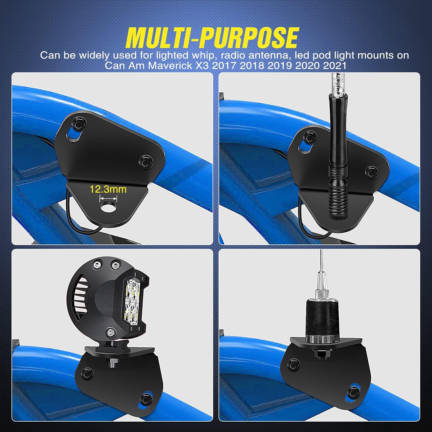 Specifications: Nilight Can am X3 Whip Mounts Specially designed for flag antenna whip mounts on the rear pillar on Can am Maverick X3 2017-2021, direct use with factory bolts, no modification required. Mounting bracket thickness: 2.9mm Hole size for flag/antenna/whip mount: 12.3mm (0.48inch) Finish: Black powder coating Material: Heavy duty steel