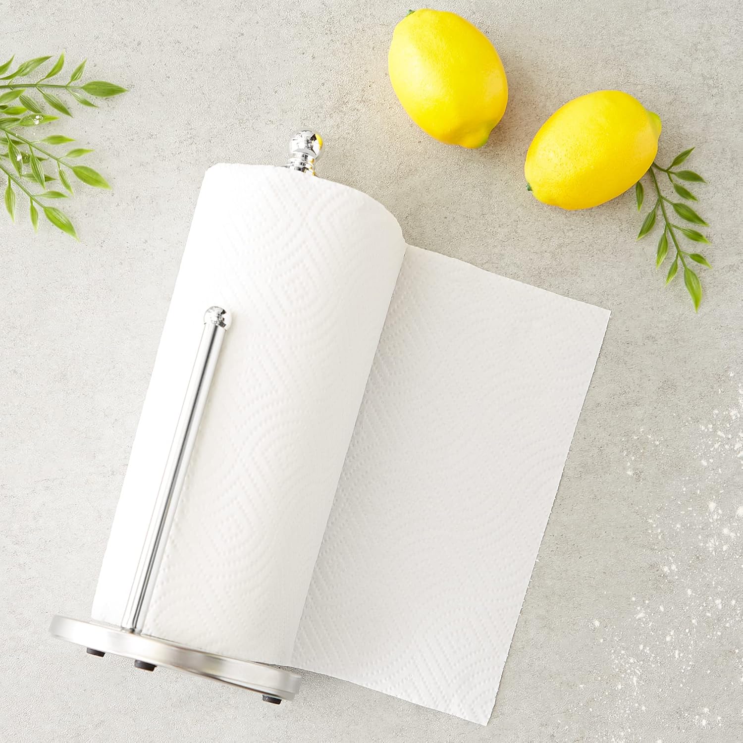 Measures 6-inches in diameter by 13.25-inches tall. Polished chrome creates a classy addition to any kitchen space. Features arm to break paper towels. Chromed steel frame holds up and is very durable. Hand washing recommended with soap and water as needed.