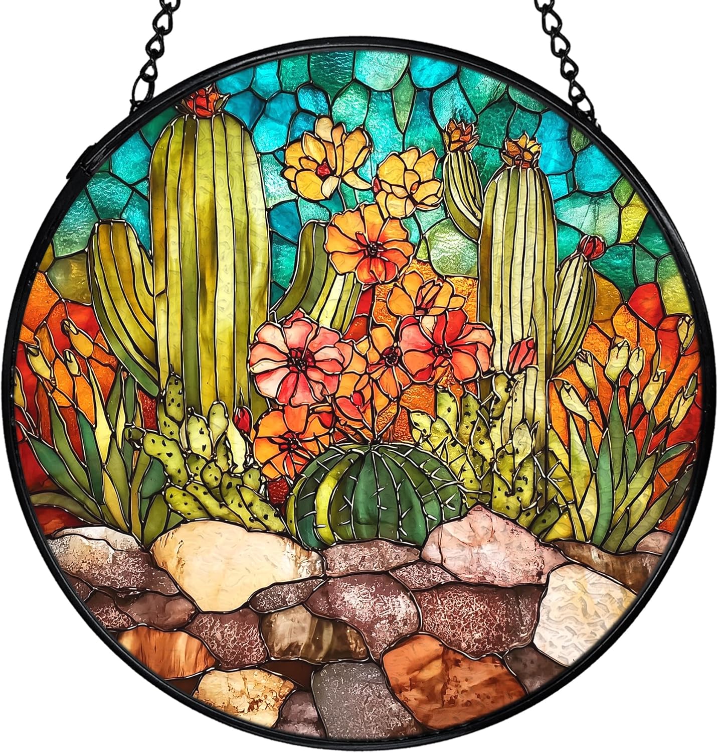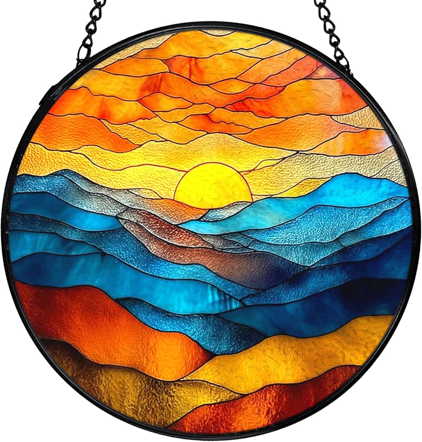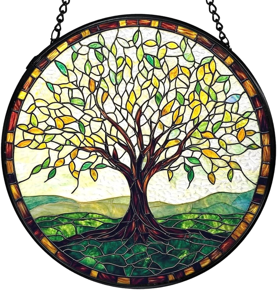 This round stained glass sun catcher brings a colorful accent to windows, walls, or bright indoor areas. Made from real stained glass with a lightly textured surface and smooth backing, it creates a gentle play of light as the sun or room lighting passes through. The piece measures 7.9 inches in diameter and is framed with a metal edge for stability. A matching chain and hook are included, making it simple to hang in different spaces.