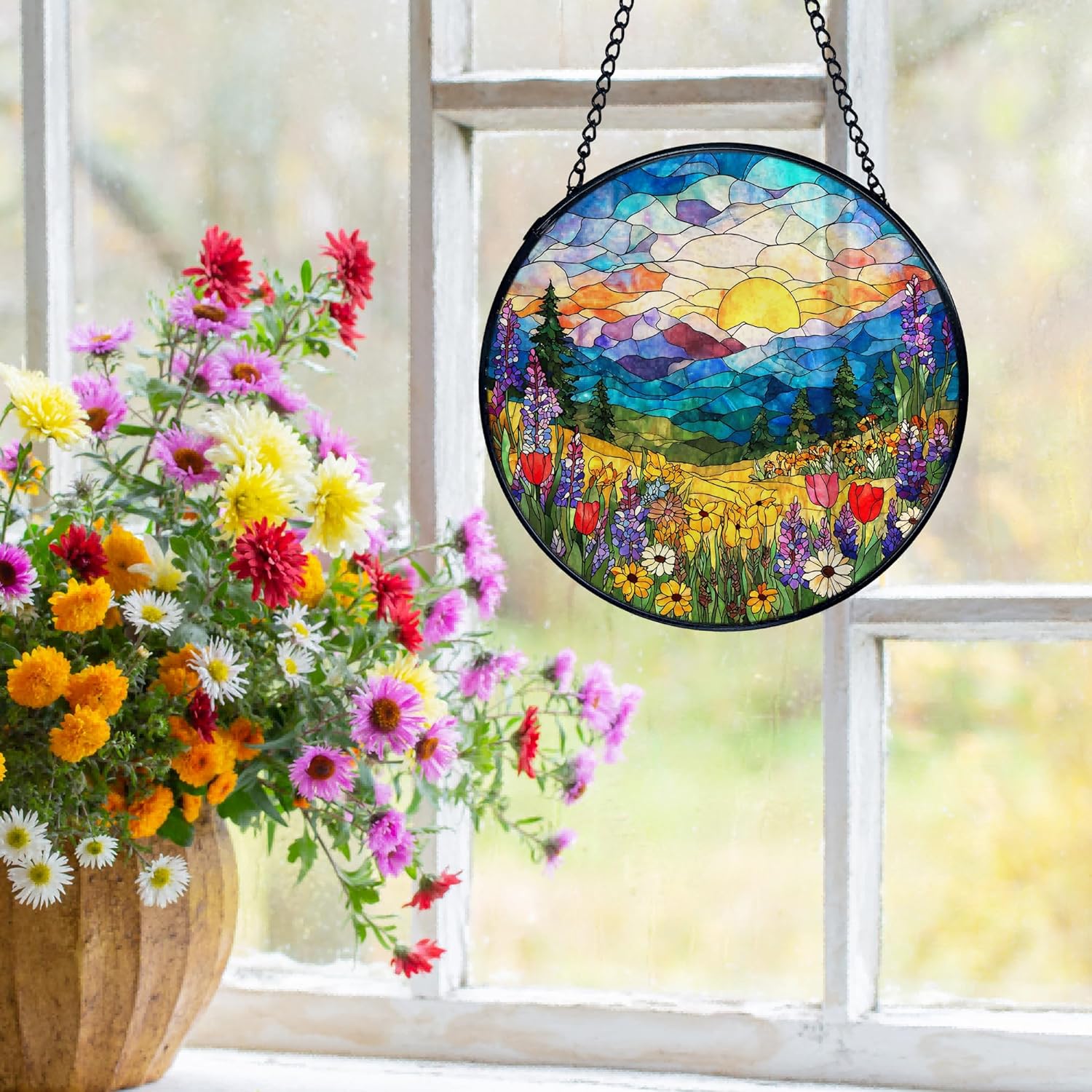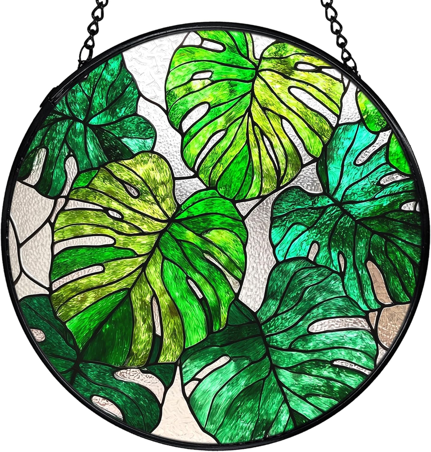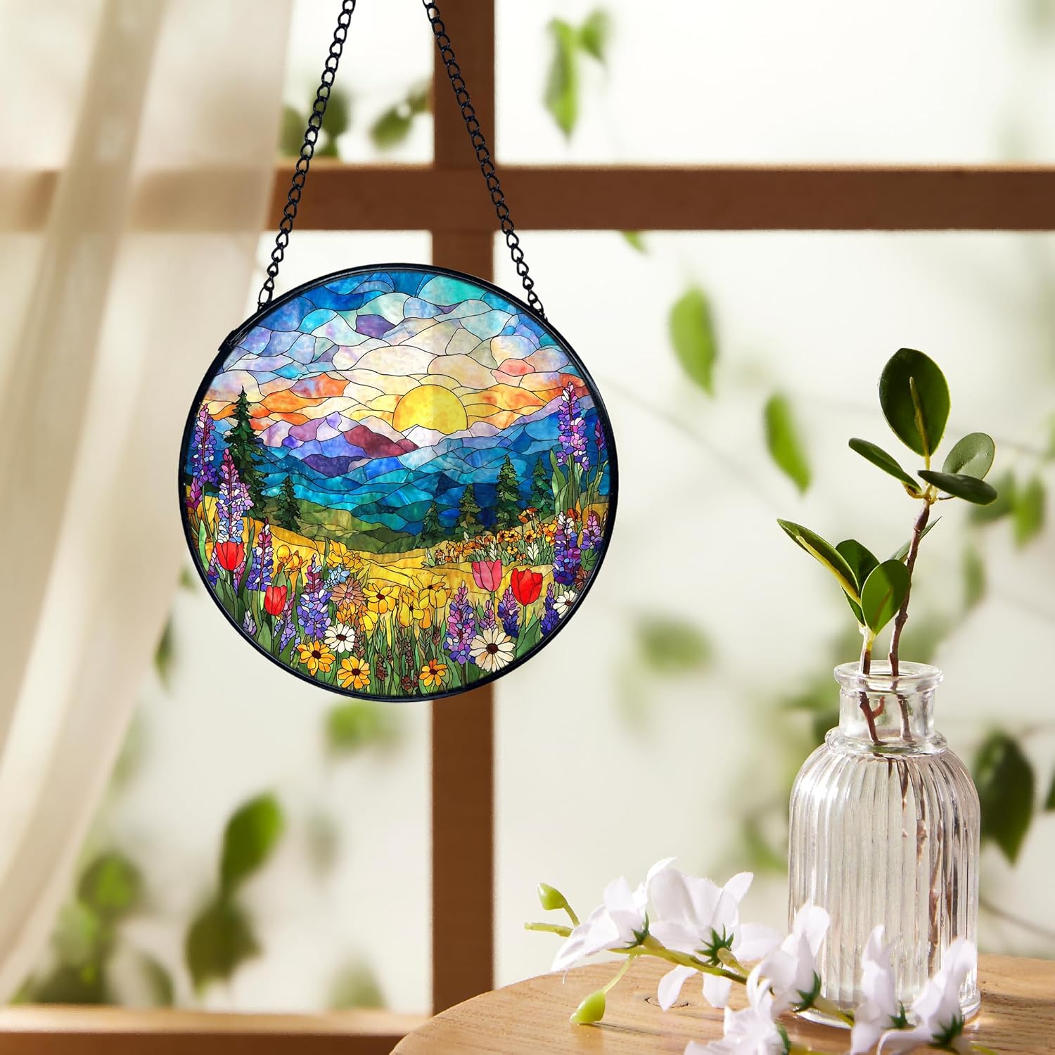 This round stained glass sun catcher brings a colorful accent to windows, walls, or bright indoor areas. Made from real stained glass with a lightly textured surface and smooth backing, it creates a gentle play of light as the sun or room lighting passes through. The piece measures 7.9 inches in diameter and is framed with a metal edge for stability. A matching chain and hook are included, making it simple to hang in different spaces.
