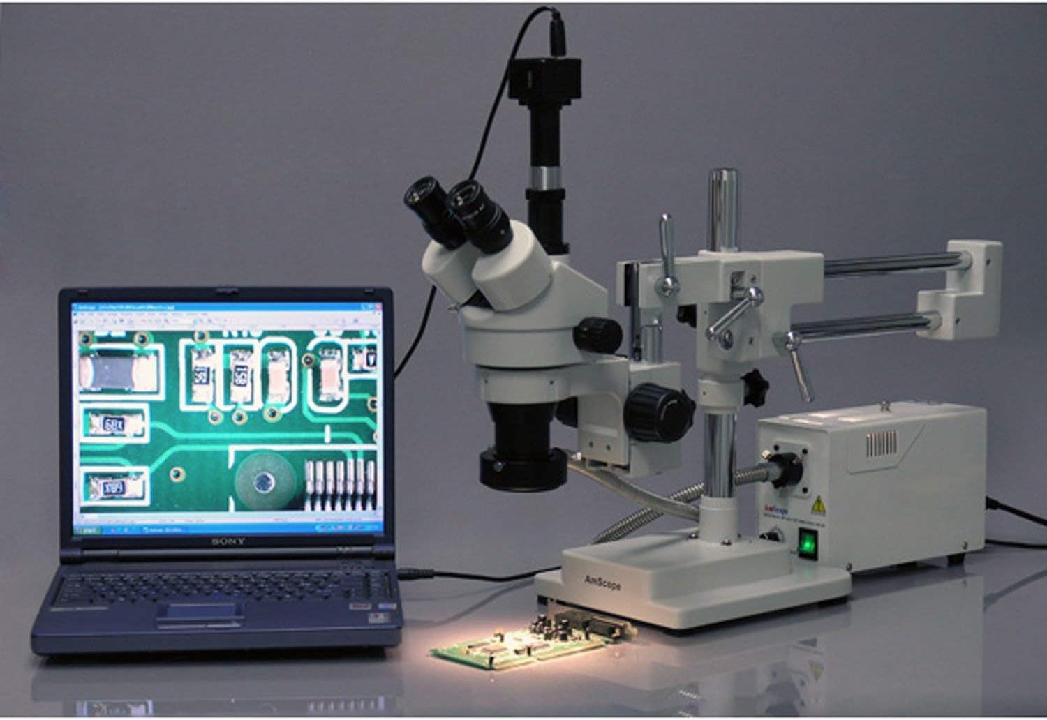 The AmScope SM-4TPZ-FOR-M digital professional trinocular stereo zoom microscope has a pair of 10x super-widefield high-eyepoint eyepieces, a 0.7x-4.5x zoom objective, two Barlow lenses, and a double-arm boom stand. The microscope has an overall magnification range of 3.5x-90x. The 1.3MP camera has a CMOS color sensor, a reduction lens, image capture and editing software, and USB 2.0 output to capture or display still or video images on a computer or projector. The trinocular viewing head offers simultaneous viewing through the eyepieces and trinocular port, and has an interpupillary range of 55 to 75mm, a 45-degree inclination to reduce eye and neck strain, and 360-degree rotation to enable sharing. The vertical trinocular port can be used as a C-Mount or 23mm photo port. The WH10x20mm super-widefield high-eyepoint eyepieces combine with the 0.7x-4.5x zoom objective to provide continuous zoom magnification and a longer working distance for inspecting large-scale specimens that require handling or repair. The microscope comes with 0.5x and 2.0x Barlow lenses that can be added to the objective to increase the magnification range. A Barlow lens with a magnification of less than 1.0 reduces magnification and increases the working distance, while a Barlow lens with a magnification greater than 1.0 increases the magnification and reduces the working distance. High-eyepoint eyepieces ease viewing for users who wear glasses, and dioptric adjustment accommodates individual eye-strength differences. A digital stereo microscope, sometimes called an inspection or dissection microscope, has low magnification and a long working distance that enables users to manipulate the object being inspected, and is used where image capture, detailed records, or documentation is required. The 1.3MP digital camera has a CMOS color sensor for displaying still microscopy images and streaming live videos to a computer or projector. The camera has 40x magnification and a 0.37x reduction lens that ensures that the display has a similar field of view as the microscope eyepiece. The camera can be mounted in a C-Mount or any 23mm eye tube. The camera includes image capture and editing software that provides still image and live video capture and editing capability, including measurement functions. The software supports JPG, TIF, GIF, PSD, WMF, and BMP file formats and is compatible with Windows XP, Vista, 7, and 8; Mac OS X; and Linux. Camera drivers are compatible with Windows XP, Vista, 7, and 8; Mac OS X; and Linux. The software includes Windows APIs for native C/C++, C#, DirectShow, Twain, and LabVIEW that enable custom application development. The camera has a USB 2.0 data port (cable included).The fiber-optic ring light has a 150W/21V cool-light halogen light source for observing temperature-sensitive specimens. The ring light provides shadow-free illumination, and a rheostat controls the amount of light emanating from the lamp. The ring light has a 2-1/8" (56mm) inner diameter, a 3-1/8" (80mm) outer diameter, and a 35" (890mm) metal-sheathed light cable. Power and adjustment controls are located on a control box to speed adjustments. The light source has a forced-air cooling system to prevent overheating, and a built-in filter slot can be used to change the light color (filters sold separately). The top-mounted door eases access to the bulb, and automatically turns off the power supply when opened. The light uses a 110V power supply. The microscope has a double-arm boom stand that enables users to position the microscope head on all three axes (X, Y, and Z). Bilateral focus eases use for left- and right-handed users. The stand has 20" double arms, and a 30" overall length. The pillar is 17" and the focus rack has a 3" diameter. The solid cast-steel base is 2 x 8-1/4 x 10-1/4 inches (H x W x D, where H is height, the vertical distance from the lowest to highest point; W is width, the horizontal distance from left to right; D is depth, the horizontal distance from front to back).Microscope SpecificationsHeadTrinocularMagnification range3.5x-90xZoom objective power0.7x-4.5xEyepieces (DIN, 30mm)WH10x20mm high-eyepointTrinocular portC-Mount or 23mmField of view2-1/2"Optical working distanceUp to 8"Microscope standDouble-arm boom standHead movementX-, Y-, and Z-axesIllumination typeEpiscopic (reflected)Light sourceFiber-optic ring light, 150W/21V halogenPower110V-120VCamera SpecificationsResolution1.3MP (1280 x 1024 effective pixels)Image typeStill image and video display and captureCamera typeBrightfieldCamera sensor1/2" Aptina MT9M111 CMOS (color)Magnification40xReduction lens0.37xMounting size23mm or C-MountFrame rate50fps at 320x256; 26fps at 640x512; 15fps at 1280x1024Computer connectionUSB 2.0 (backward compatible on PCs only)File formatsJPG, TIF, GIF, PSD, WMF, BMPSoftware packageImage capture and editing for Windows XP, Vista, 7, and 8; Mac OS X; and LinuxCamera driver compatibilityWindows XP, Vista, 7, and 8; Mac OS X; and LinuxMicroscopes are instruments used to enhance the resolution of an object or image. Types include compound, stereo, or digital. Compound microscopes use a compound optical system with an objective lens and an eyepiece. Stereo microscopes show object depth in a three-dimensional image. Digital microscopes are used to display an image on a monitor, rather than looking through a lens. Microscopes can have monocular (one), binocular (two), or trinocular (three) eyepieces, with varying magnification abilities. Magnification ability refers to the size of an image. Resolution, also known as resolvant power, refers to the clarity of the image. The interaction between field of view (FOV), numerical aperture (NA), and working distance (WD) determines resolution. Microscopes can control magnification through a fixed focus, or through a range of adjustments. They can also utilize LED, fluorescent, and mirror light sources to help control viewing capabilities. Microscopes are widely used in education, l