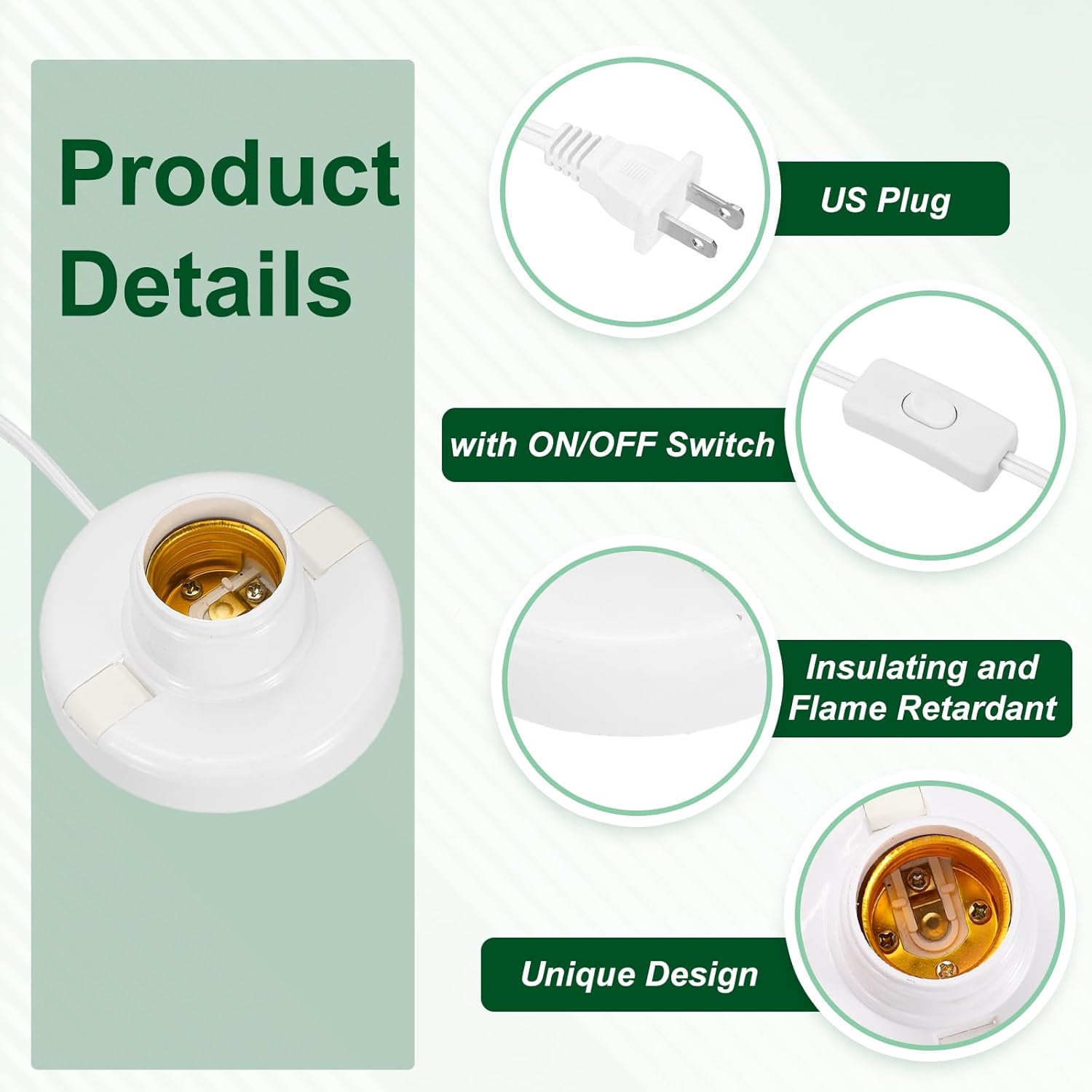 Specifications:Material: Plastic, copper conductor;Color: White;Cable length: 4500mm;Rated power capacity: 50W;Electrical interface standard: E26 screw base, two-prong parallel plug (AC120V/60Hz)Applications:This versatile extension cord is designed for a wide range of indoor environments, making it perfect for use in kitchens, bedrooms, bathrooms, dining rooms, and cafes, as well as more functional spaces like garages and tool rooms. Usage Guides:Using this pendant light cord is simple and straightforward. First, securely screw your preferred E26 base light bulb, ensuring it does not exceed the maximum 50W rating, into the socket. Next, plug the attached two-prong connector into any standard indoor wall outlet. Finally, you can easily turn your new light on or off using the convenient switch located on the cord itself. Key Advantages:The hanging light cord is made of plastic and copper conductors, is insulated and flame-retardant, can be installed without tools, and integrates a switch, making it extremely convenient to use and providing lighting without complicated wiring.Package Contents:The package includes one complete E26 pendant light socket adapter, which comes pre-wired with a built-in on/off switch for easy control. This is attached to a 4.5-meter (approximately 14.8-foot) power cord, ending in a standard two-prong plug, providing ample length for flexible placement.