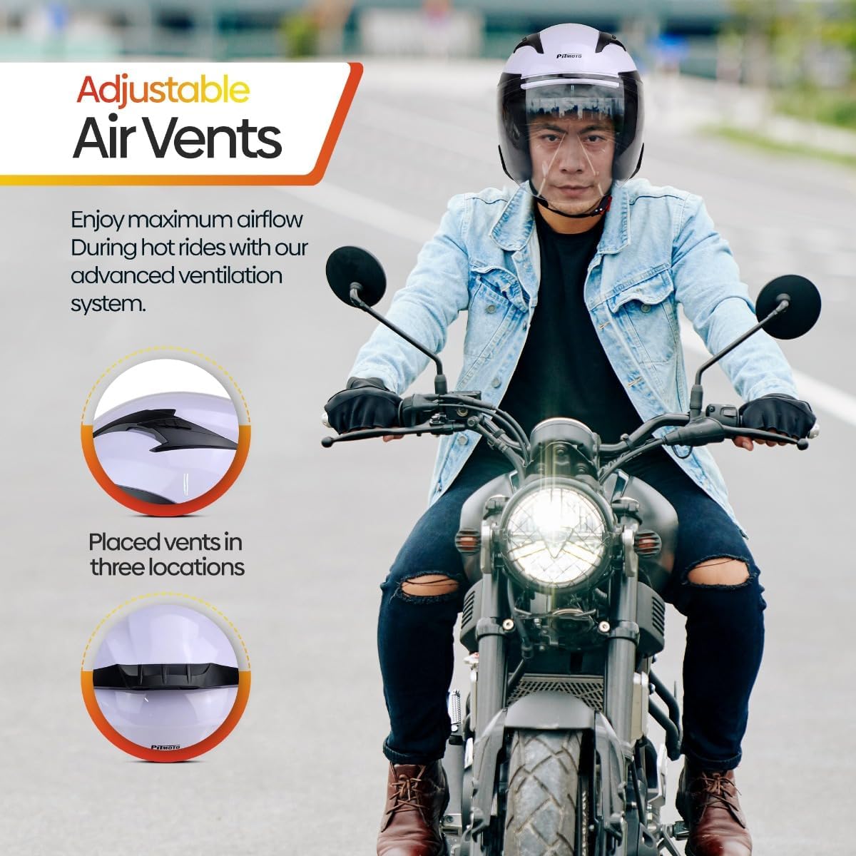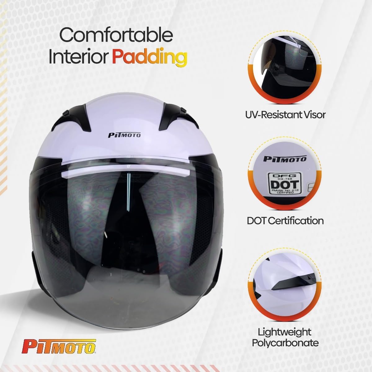 Ride in Confidence with the PITMOTO DOT Open-Face Motorcycle Helmet, Model PM-768Experience unmatched safety and style with the PITMOTO PM-768 Open-Face Motorcycle Helmet. This helmet not only exceeds DOT safety standards but is also engineered with a lightweight Polycarbonate/ABS shell construction, ensuring that safety doesn't come at the cost of comfort.For Helmet Fitment Chart, please refer to the product images.