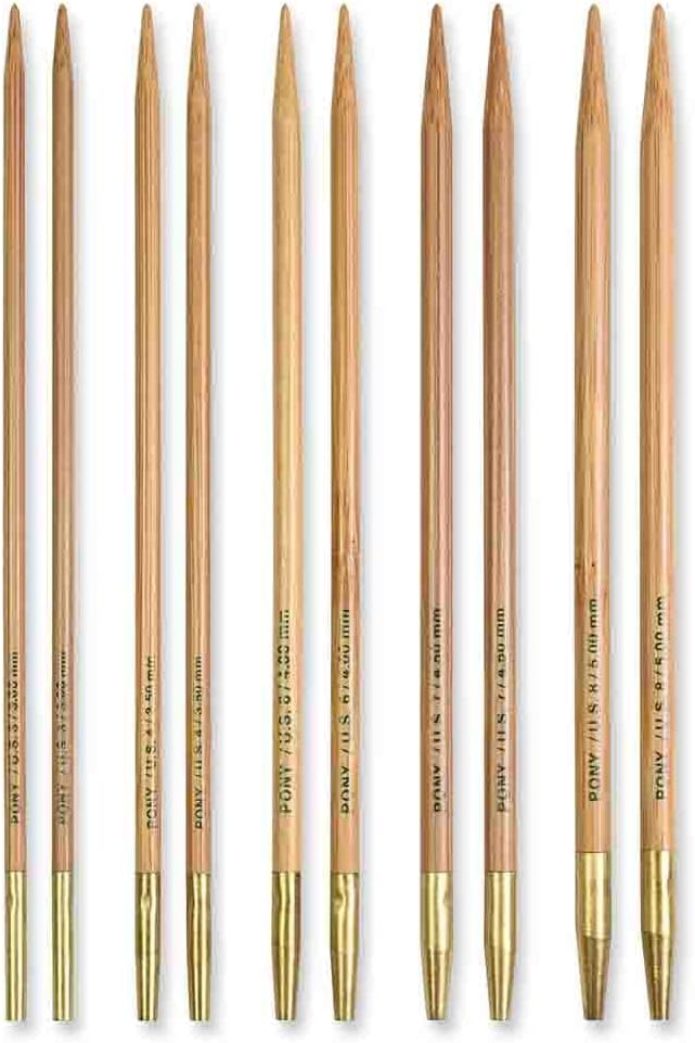 Pony Bamboo Assorted Interchangeable Circular Knitting Needle smooth lightweight feel of precious unbleached Indian bamboo knitting pins with a warm and natural touch for easy knitting. 5 pairs of 14cm pin shanks in sizes 3.00, 3.50, 4.00, 4.50 and 5.00mm; 3 cables for three lengths, 60, 80 and 100cm; 2 knobs for cable ends; 1 connector to combine cables.