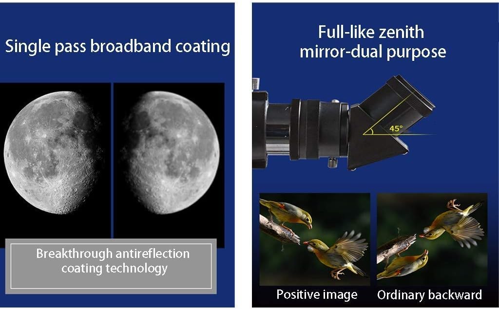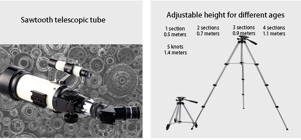 1. The refractor has a strong focal length, a large field of view, and a strong resolution.Multilayer optical coating,Refractive optical system,high light transmittance, and enhanced image brightness and clarity.Aluminum tripod 2. It is very suitable for astrometric work, and it performs well in observing the moon, planets, and binary stars. Easy to observe the ground view, very suitable for enlarged photography of the moon and planets 3. The telescope is suitable for beginners or children. It is easy to install and observe for beginners. It will encourage children to like learning space, get close to nature and stay away from electronic products. And provide a wonderful holiday or birthday gift idea for children who like science and astronomy. 4. The telescope provides our customers with a 24- warranty. If you have any questions about quality after receiving this space telescope, please contact us for the first time. We provide a high standard of 24/7 customer service, and will do our best to solve it for you until you are satisfied.