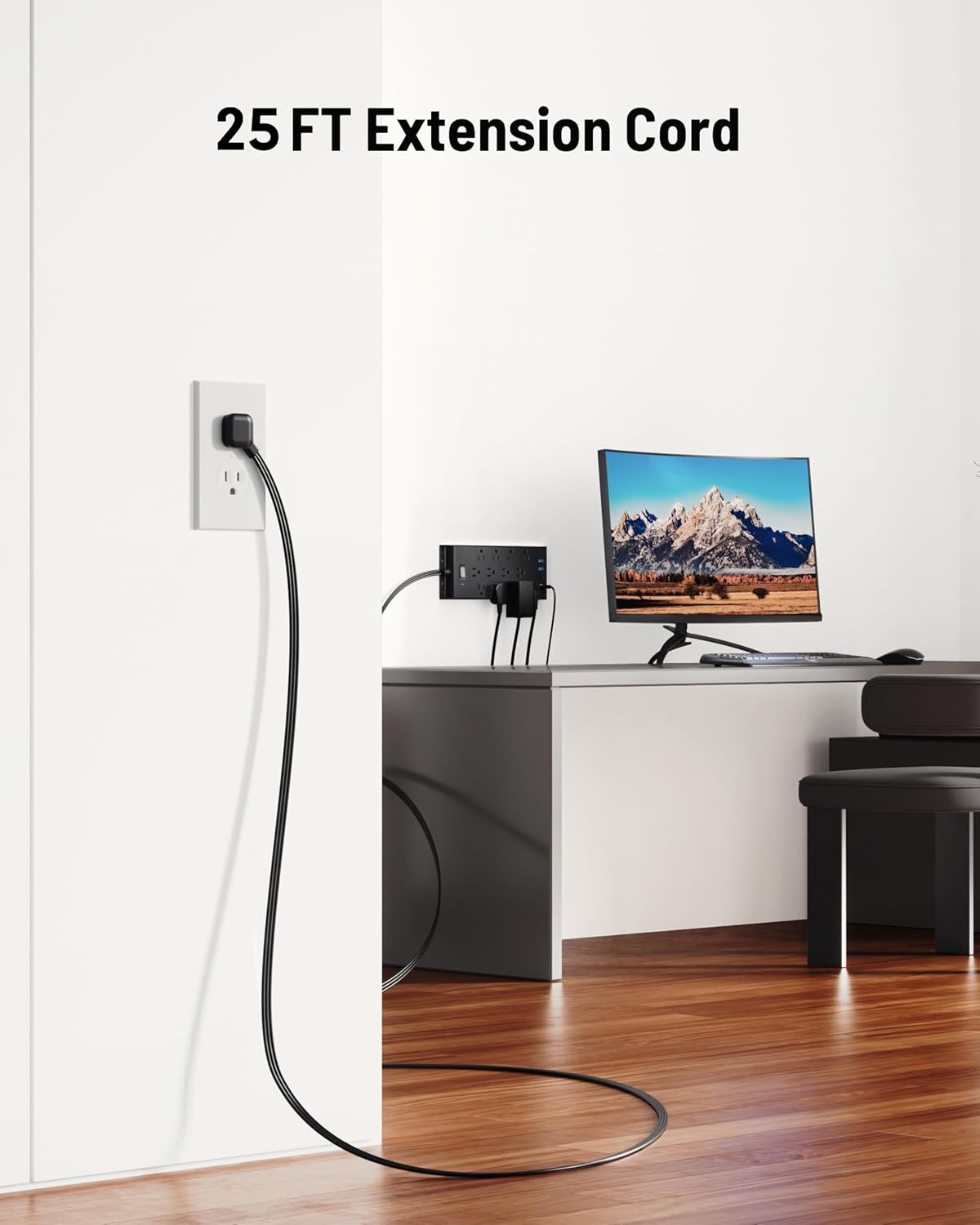 Surge Protector Power Strip 4800J, LeZone 25Ft Long Extension Cord Flat Plug, 12 Outlets 2 USB C 2 USB Ports, Wall Mountable, Desk Charging Station, Black